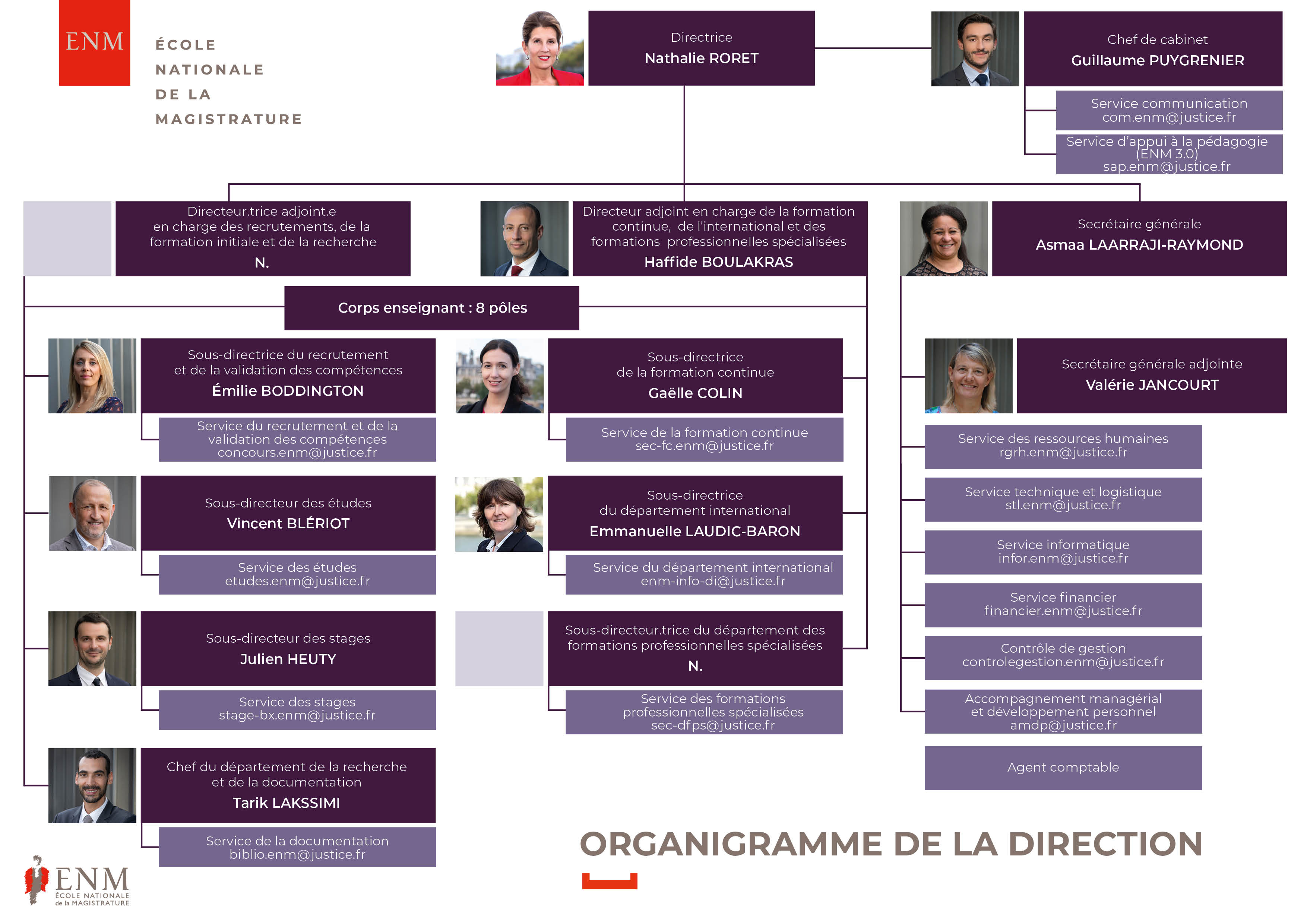 La gouvernance est assurée de manière collégiale par un comité de direction composé de magistrats détachés et de professionnels non issus du monde judiciaire.